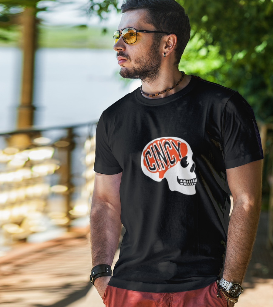 Cincy On The Brain Football Helmet Skull Shirt made from 100% pre-shrunk ring-spun cotton, unisex regular fit based on U.S. standard sizing. The shirt is designed, cut, sewn, and printed in the United States. Available in sizes S-5XL.