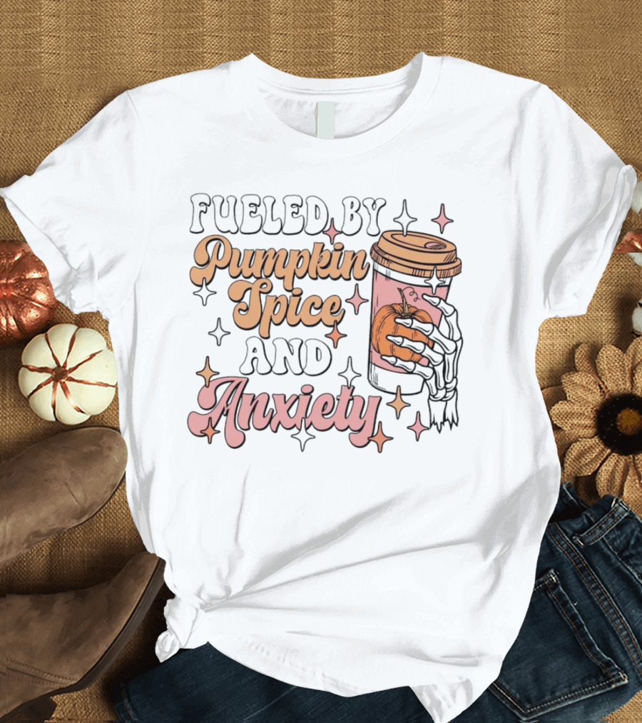 Fueled by Pumpkin Spice and Anxiety Skeleton Hand Shirt made from 100% pre-shrunk ring-spun cotton, unisex regular fit based on U.S. standard sizing. The shirt is designed, cut, sewn, and printed in the United States. Available in sizes S-5XL.