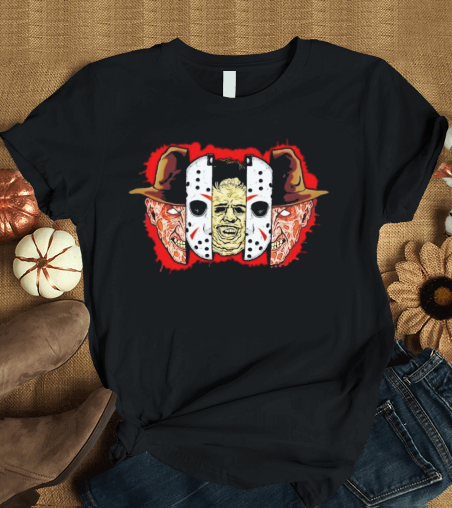 Michael Myers Jason Voorhees Freddy Krueger Slasher Trio Mask Horror Icons Shirt made from 100% pre-shrunk ring-spun cotton, unisex regular fit based on U.S. standard sizing. The shirt is designed, cut, sewn, and printed in the United States. Available in sizes S-5XL.