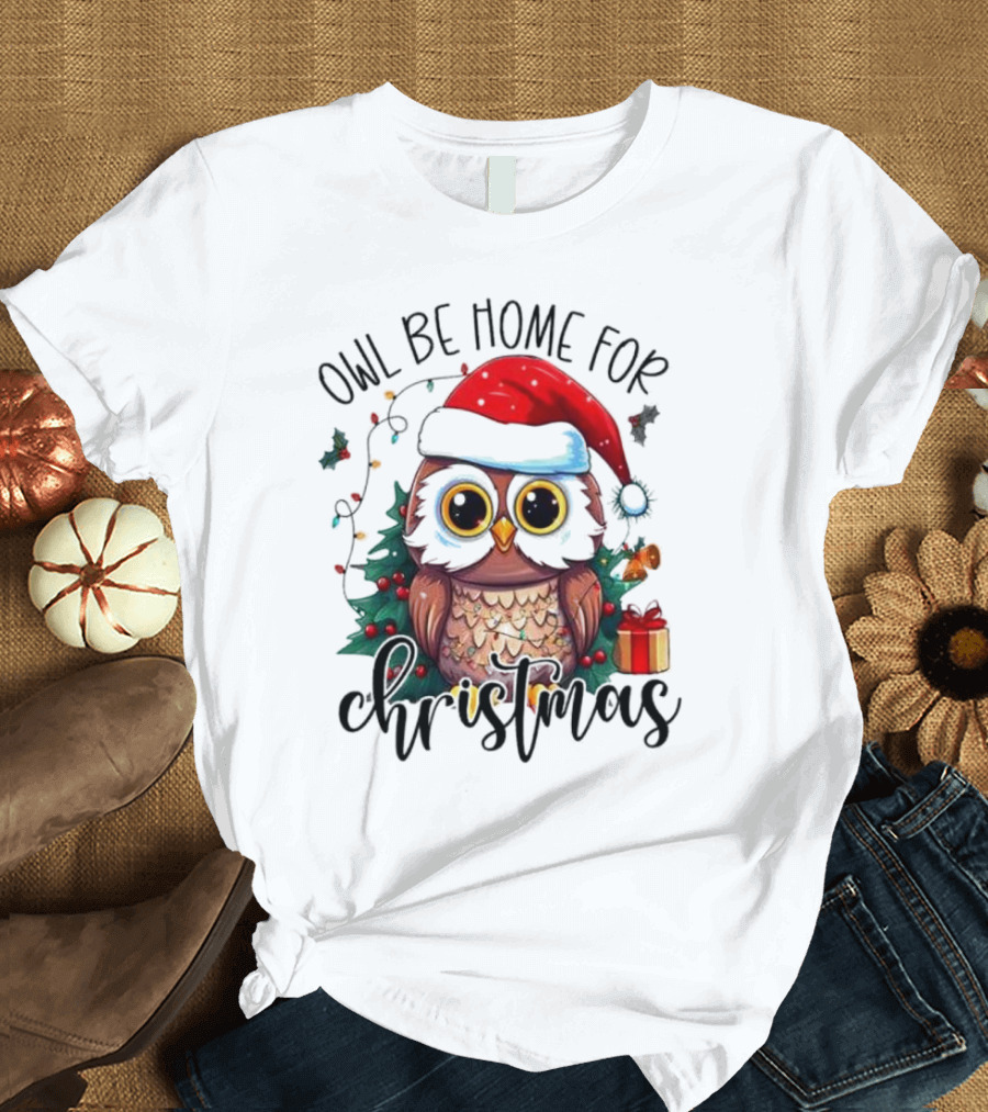 Owl Be Home for Christmas Santa Hat Owl Festive Lights Gift Box Shirt made from 100% pre-shrunk ring-spun cotton, unisex regular fit based on U.S. standard sizing. The shirt is designed, cut, sewn, and printed in the United States. Available in sizes S-5XL.