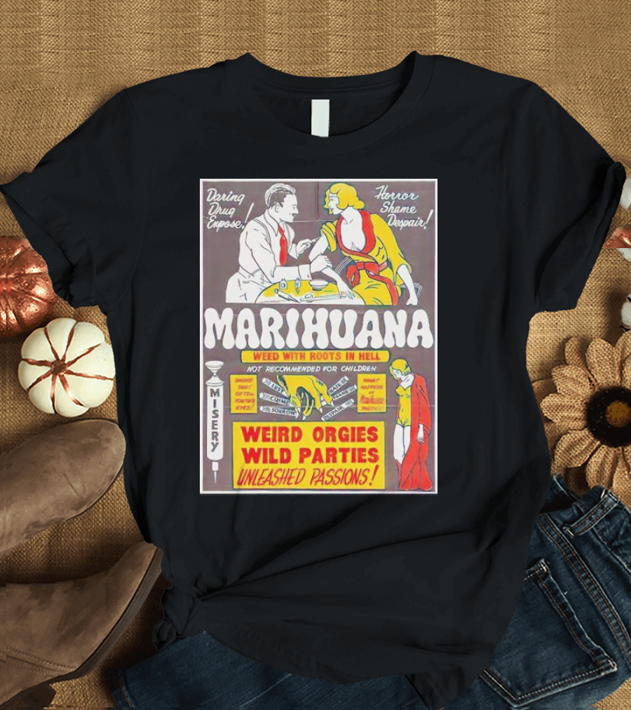 Marihuana Weird Orgies Wild Parties Unleashed Passions Horror Shame Despair Daring Drug Expose Weed With Roots In Hell Misery Not Recommended For Children T-Shirt