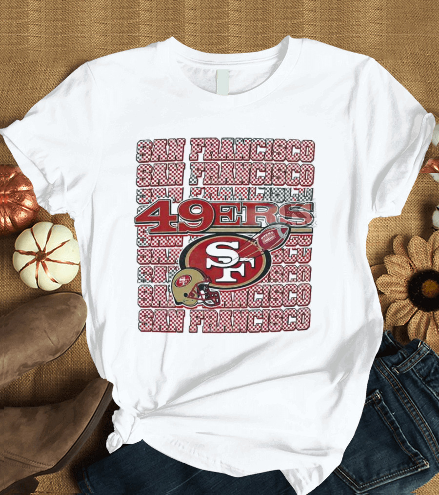 San Francisco 49ers Checkered Helmet Shirt made from 100% pre-shrunk ring-spun cotton, unisex regular fit based on U.S. standard sizing. The shirt is designed, cut, sewn, and printed in the United States. Available in sizes S-5XL.