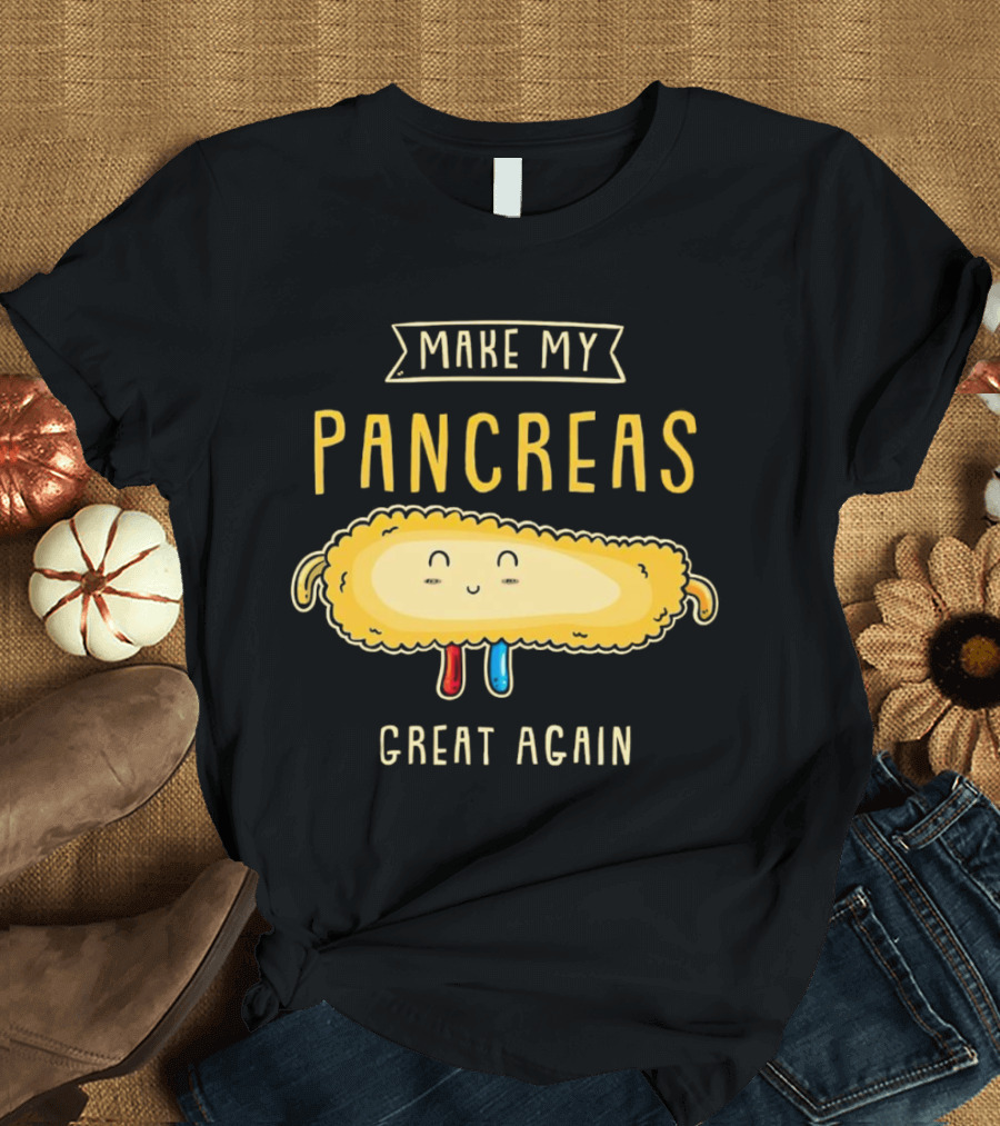 Make My Pancreas Great Again Shirt made from 100% pre-shrunk ring-spun cotton, unisex regular fit based on U.S. standard sizing. The shirt is designed, cut, sewn, and printed in the United States. Available in sizes S-5XL.