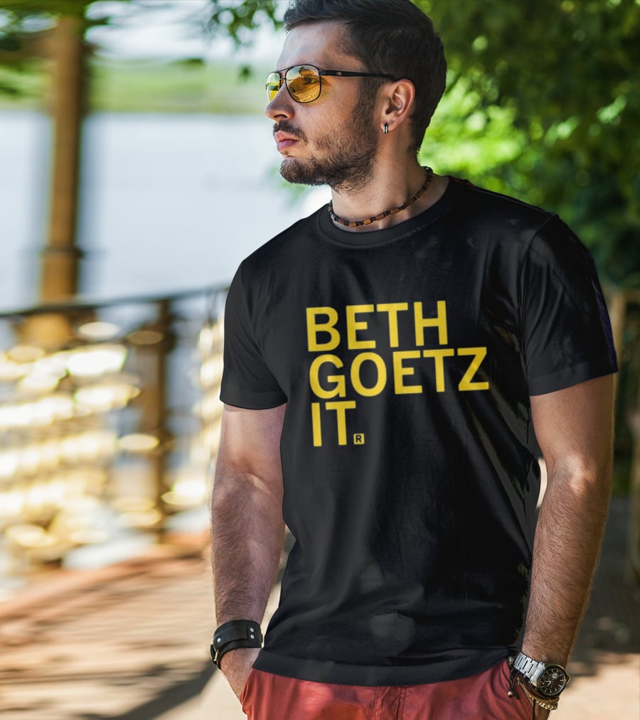 BETH GOETZ IT Shirt made from 100% pre-shrunk ring-spun cotton, unisex regular fit based on U.S. standard sizing. The shirt is designed, cut, sewn, and printed in the United States. Available in sizes S-5XL.