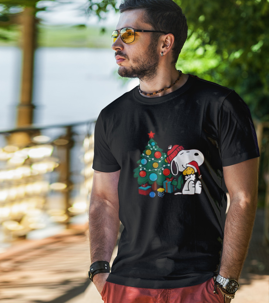 Snoopy And Woodstock Celebrating Christmas By The Tree T-Shirt