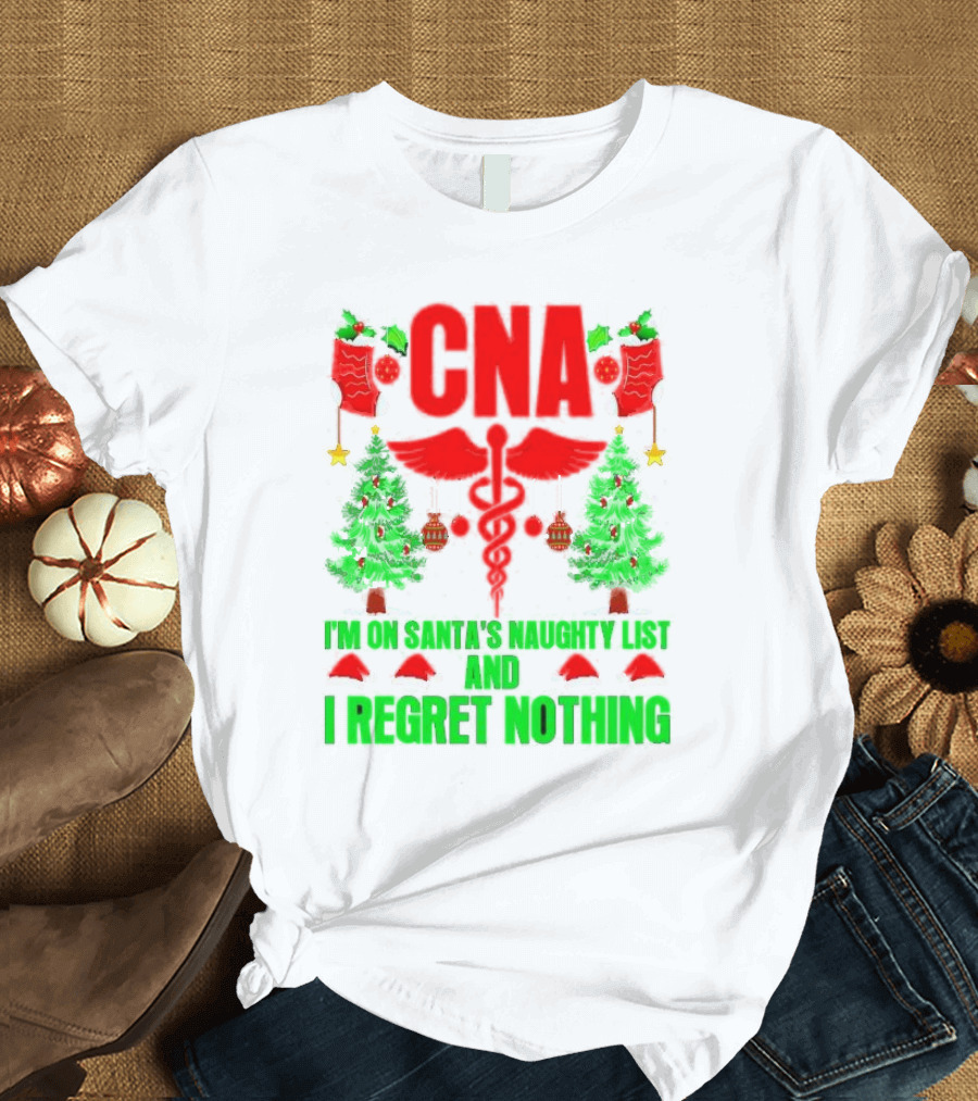 CNA I'm on Santa's Naughty List and I Regret Nothing Christmas Trees Stockings Shirt made from 100% pre-shrunk ring-spun cotton, unisex regular fit based on U.S. standard sizing. The shirt is designed, cut, sewn, and printed in the United States. Available in sizes S-5XL.