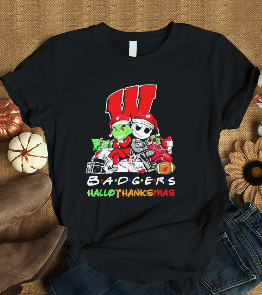 Badgers HalloThanksMas Grinch Jack Skellington Friends Football W T-Shirt