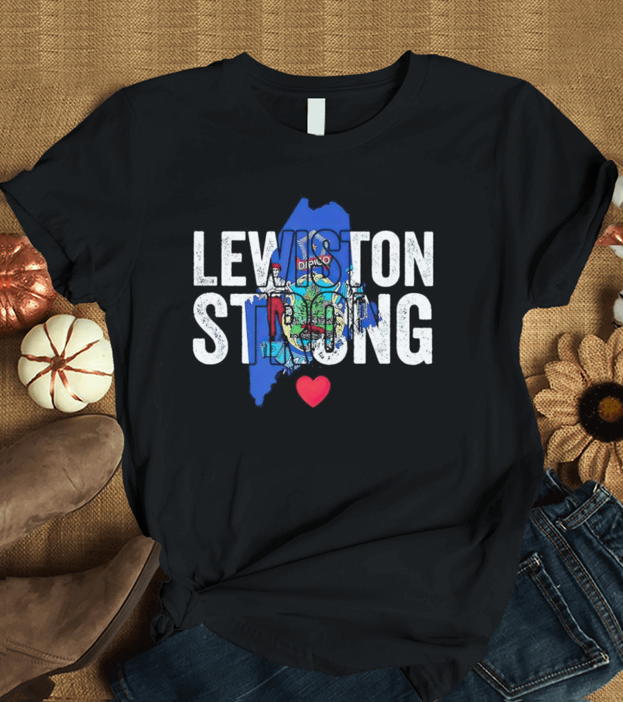 Lewiston Strong Maine Heart Shirt made from 100% pre-shrunk ring-spun cotton, unisex regular fit based on U.S. standard sizing. The shirt is designed, cut, sewn, and printed in the United States. Available in sizes S-5XL.