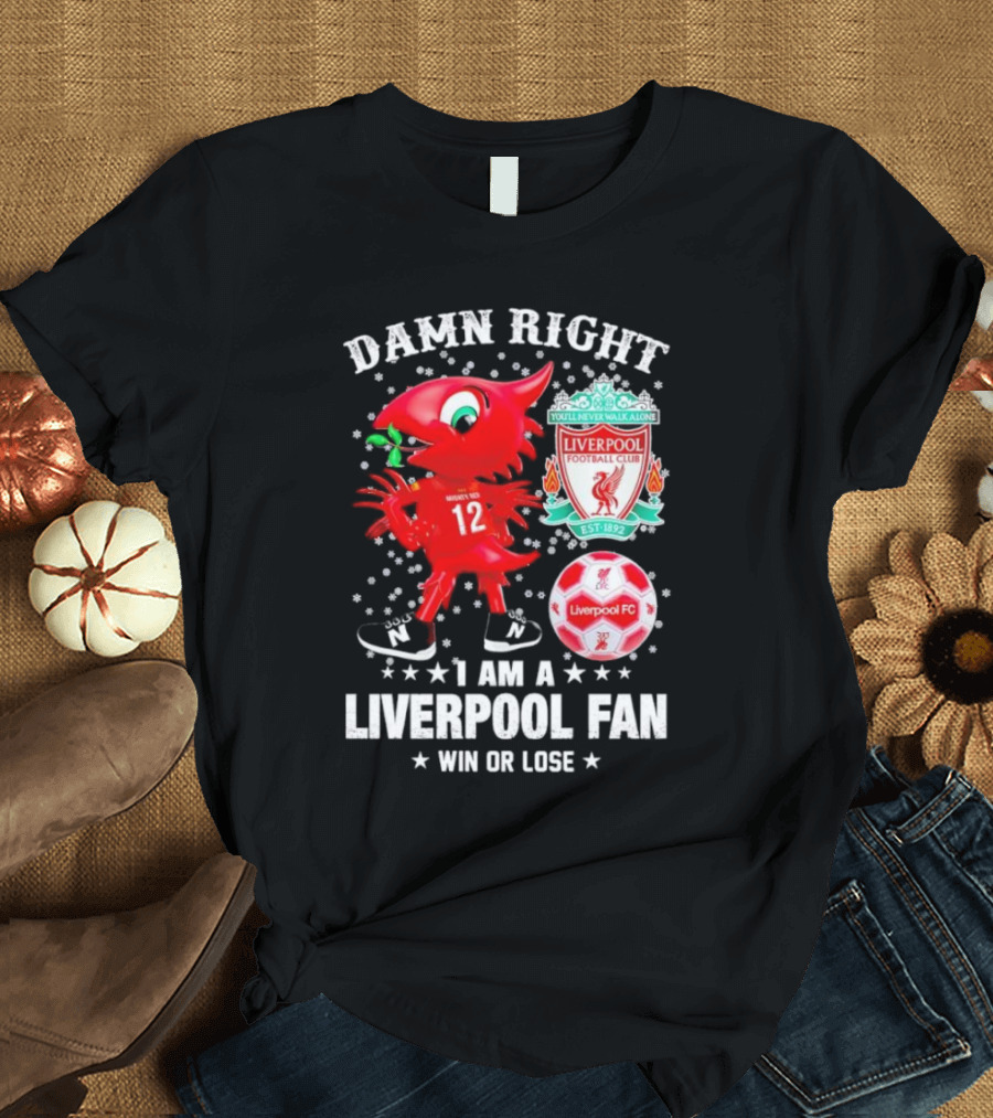 Damn Right I Am A Liverpool Fan Win Or Lose Mighty Red Snowflakes Liverpool FC Football Club Est 1892 T-Shirt