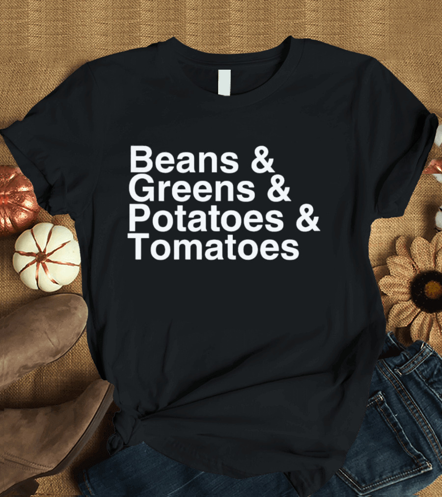 Beans and Greens and Potatoes and Tomatoes Shirt made from 100% pre-shrunk ring-spun cotton, unisex regular fit based on U.S. standard sizing. The shirt is designed, cut, sewn, and printed in the United States. Available in sizes S-5XL.