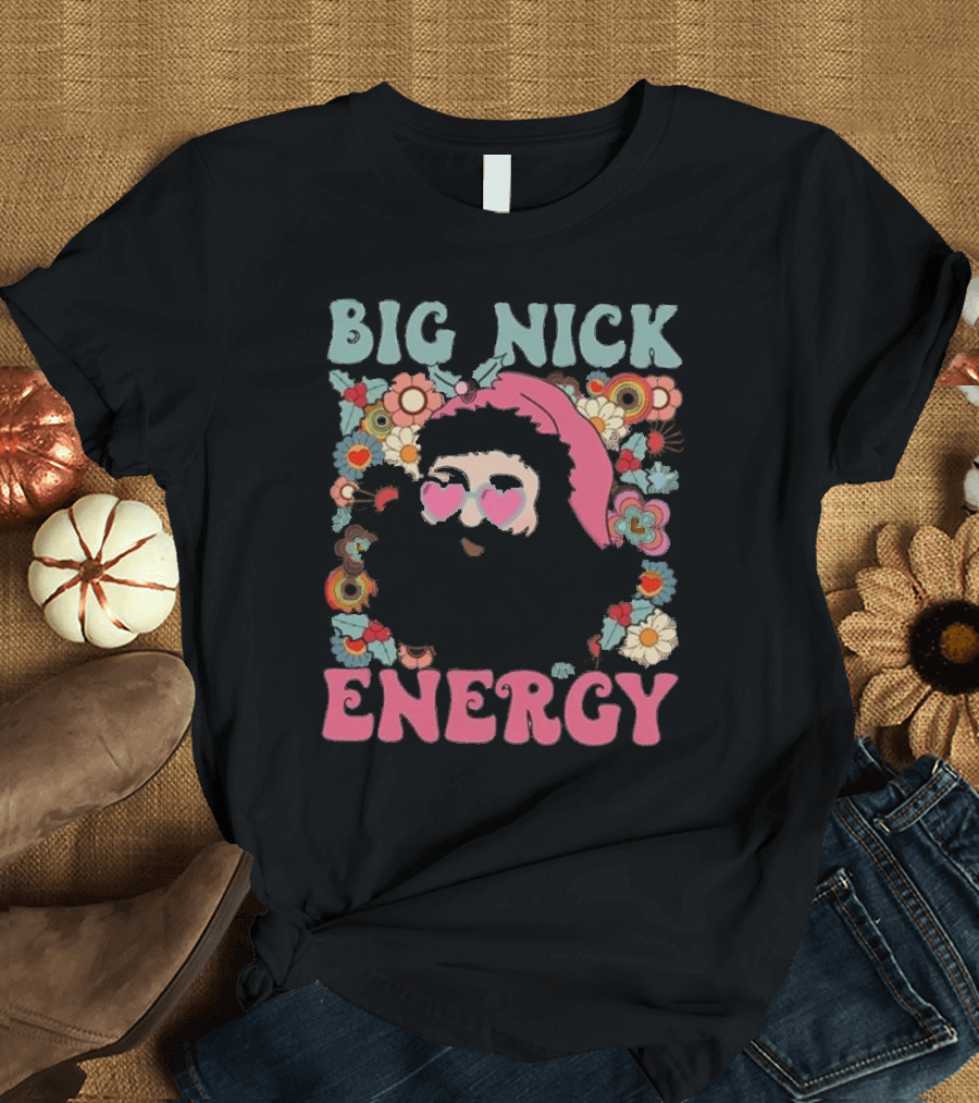 Big Nick Energy Merry Christmas Party Funny Santa with Flowers and Heart Sunglasses Shirt made from 100% pre-shrunk ring-spun cotton, unisex regular fit based on U.S. standard sizing. The shirt is designed, cut, sewn, and printed in the United States. Available in sizes S-5XL.
