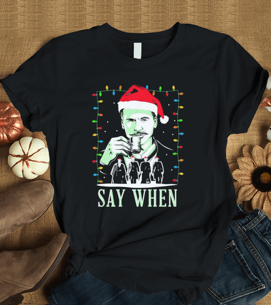 Doc Holliday Say When Christmas Lights Santa Hat Shirt made from 100% pre-shrunk ring-spun cotton, unisex regular fit based on U.S. standard sizing. The shirt is designed, cut, sewn, and printed in the United States. Available in sizes S-5XL.