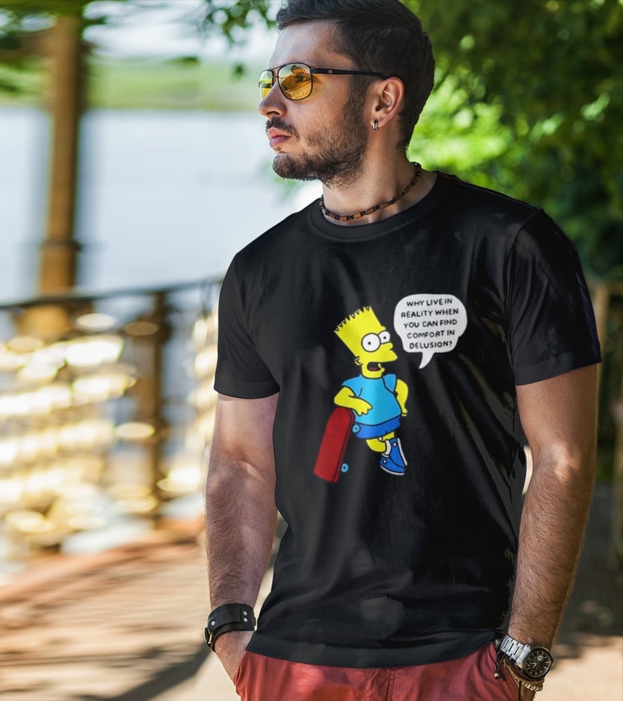 Why Live In Reality When You Can Find Comfort In Delusion Bart Skateboard Shirt made from 100% pre-shrunk ring-spun cotton, unisex regular fit based on U.S. standard sizing. The shirt is designed, cut, sewn, and printed in the United States. Available in sizes S-5XL.
