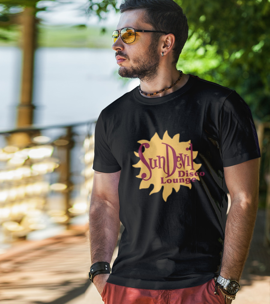Sun Devil Disco Lounge Sunburst Shirt made from 100% pre-shrunk ring-spun cotton, unisex regular fit based on U.S. standard sizing. The shirt is designed, cut, sewn, and printed in the United States. Available in sizes S-5XL.