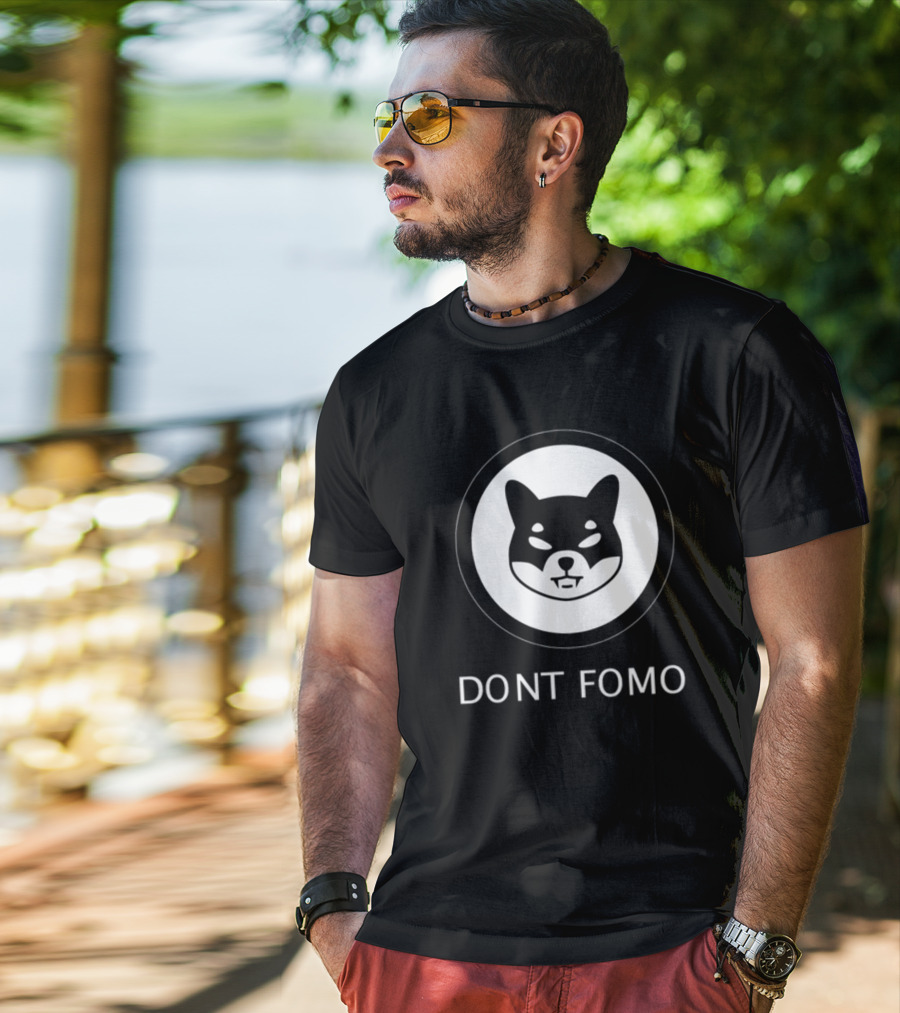 DONT FOMO SHIB Shirt made from 100% pre-shrunk ring-spun cotton, unisex regular fit based on U.S. standard sizing. The shirt is designed, cut, sewn, and printed in the United States. Available in sizes S-5XL.