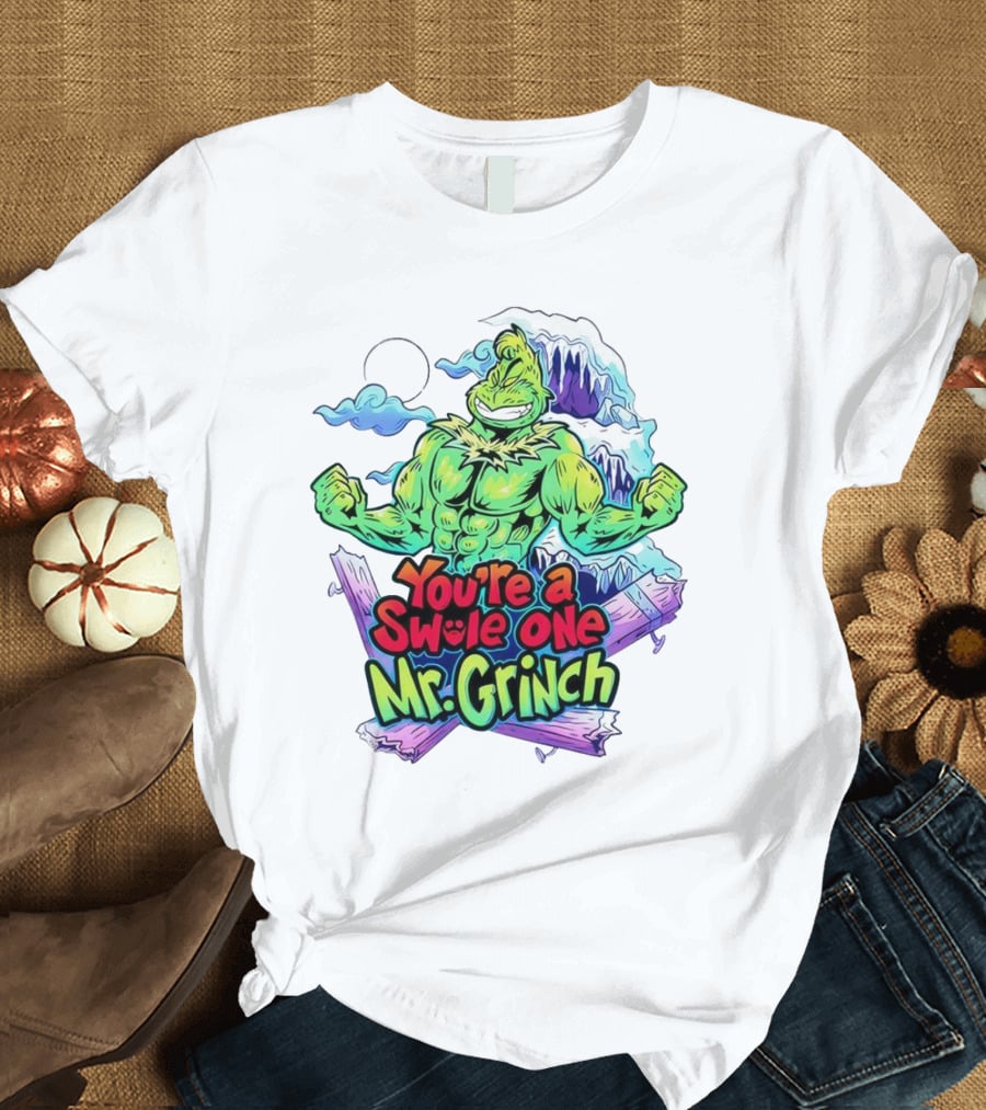 You’re A Swole One Mr Grinch Fitness Muskula Green Character With Frosted Mountain Background T-Shirt