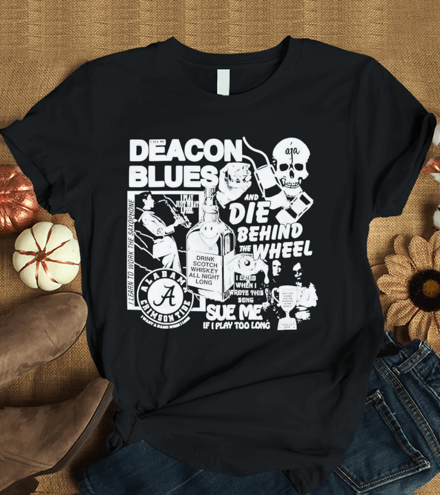 Deacon Blues Alabama Crimson Tide Drink Scotch Whiskey Sue Me If I Play Too Long Shirt made from 100% pre-shrunk ring-spun cotton, unisex regular fit based on U.S. standard sizing. The shirt is designed, cut, sewn, and printed in the United States. Available in sizes S-5XL.