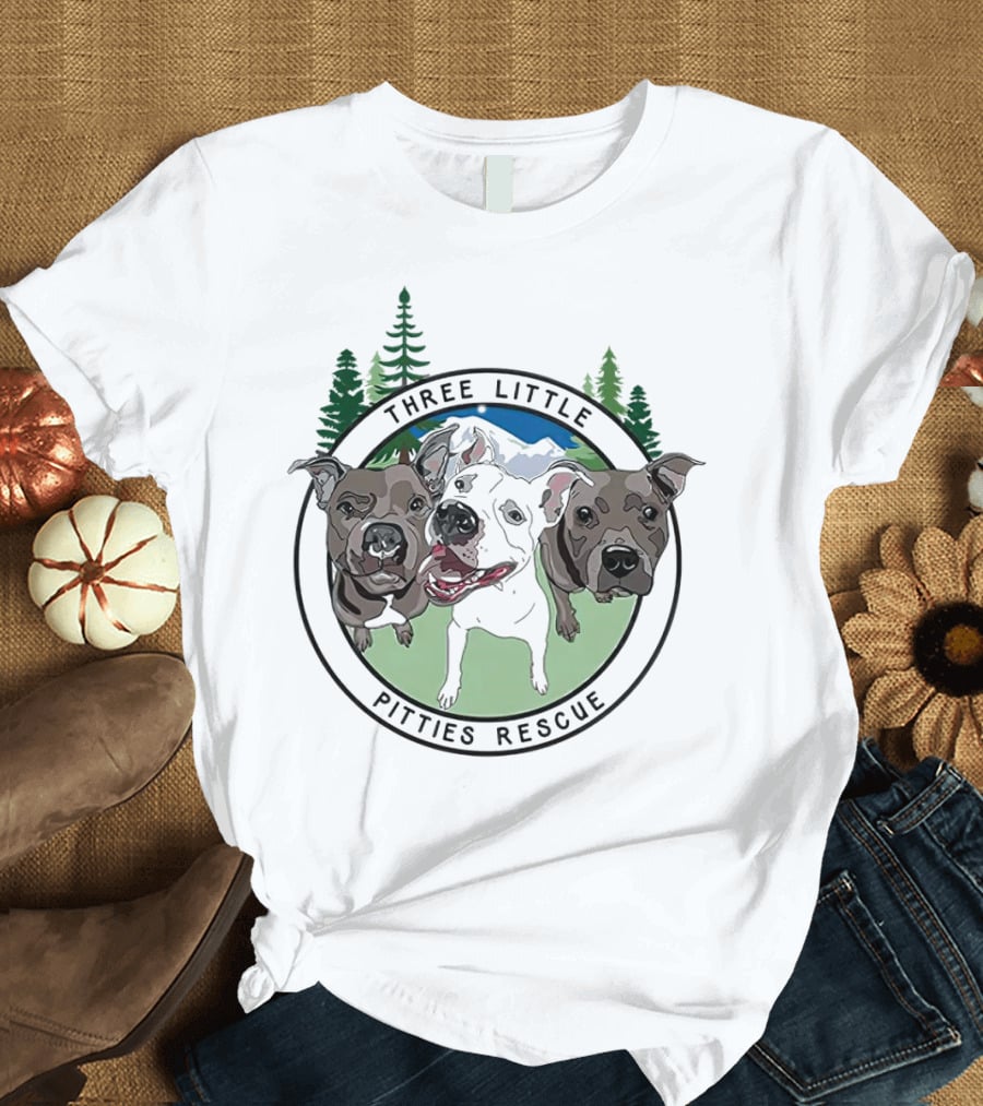 Three Little Pitties Rescue Forest Trio Dogs Shirt made from 100% pre-shrunk ring-spun cotton, unisex regular fit based on U.S. standard sizing. The shirt is designed, cut, sewn, and printed in the United States. Available in sizes S-5XL.