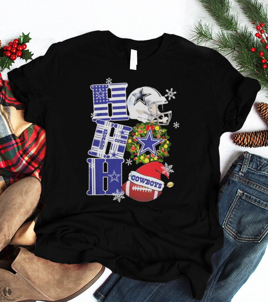Dallas Cowboys Ho Ho Ho Merry Christmas Football Helmet Wreath Snowflakes T-Shirt
