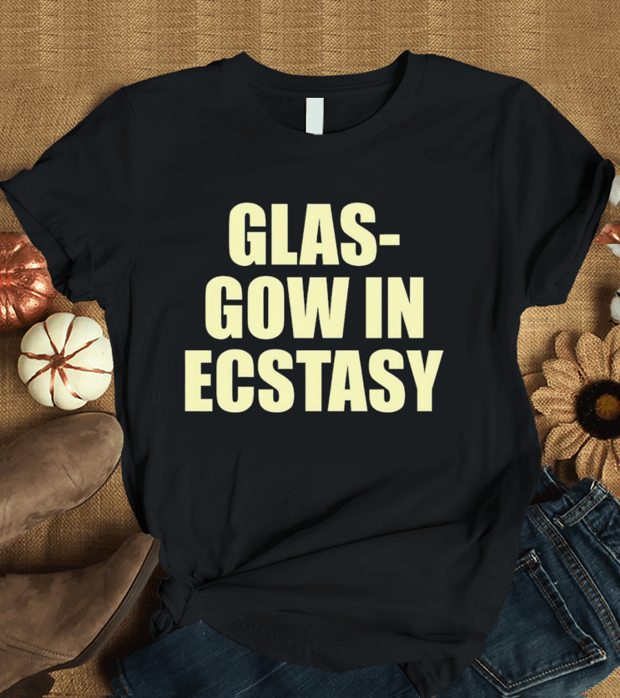 GLASGOW IN ECSTASY bold text all caps Shirt made from 100% pre-shrunk ring-spun cotton, unisex regular fit based on U.S. standard sizing. The shirt is designed, cut, sewn, and printed in the United States. Available in sizes S-5XL.