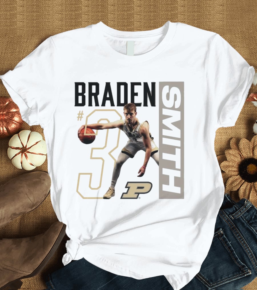 Braden Smith #3 Purdue Basketball P Shirt made from 100% pre-shrunk ring-spun cotton, unisex regular fit based on U.S. standard sizing. The shirt is designed, cut, sewn, and printed in the United States. Available in sizes S-5XL.