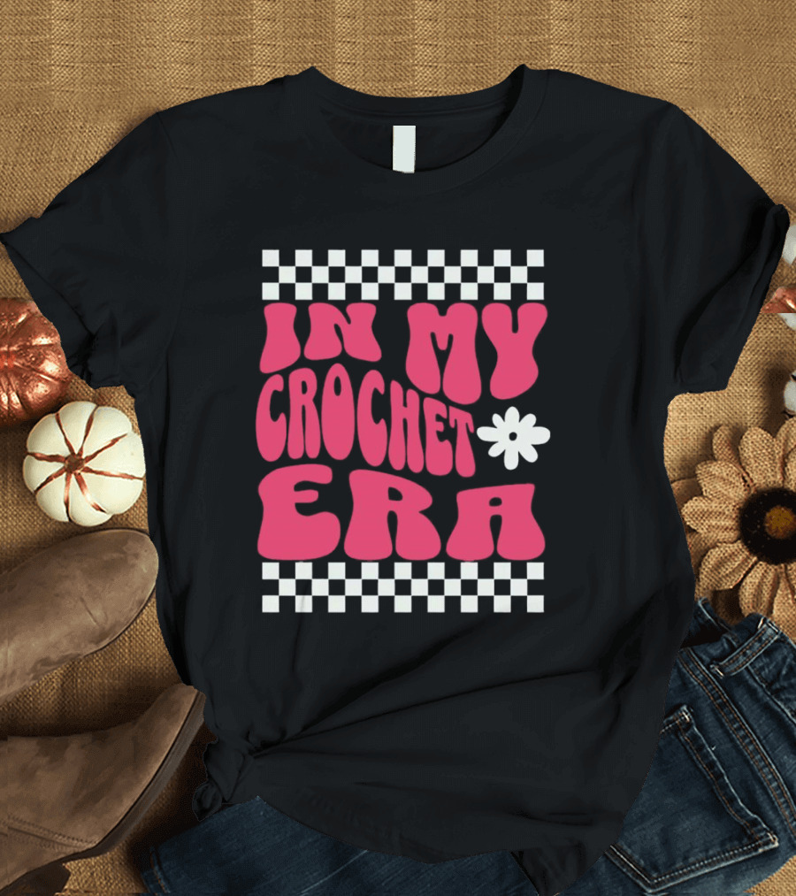 In My Crochet Era Checkerboard Flower Power Shirt made from 100% pre-shrunk ring-spun cotton, unisex regular fit based on U.S. standard sizing. The shirt is designed, cut, sewn, and printed in the United States. Available in sizes S-5XL.