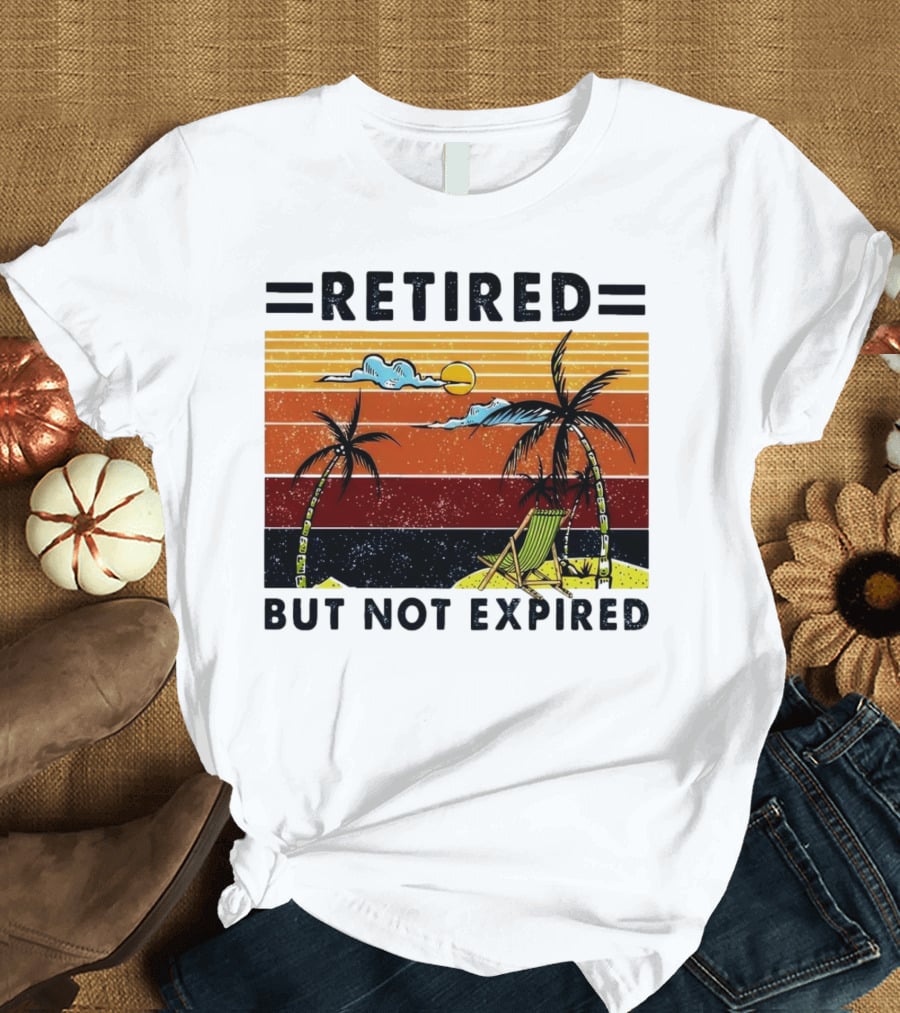 Retired But Not Expired Beach Vintage Sunset Palm Trees Chair Retro Shirt made from 100% pre-shrunk ring-spun cotton, unisex regular fit based on U.S. standard sizing. The shirt is designed, cut, sewn, and printed in the United States. Available in sizes S-5XL.