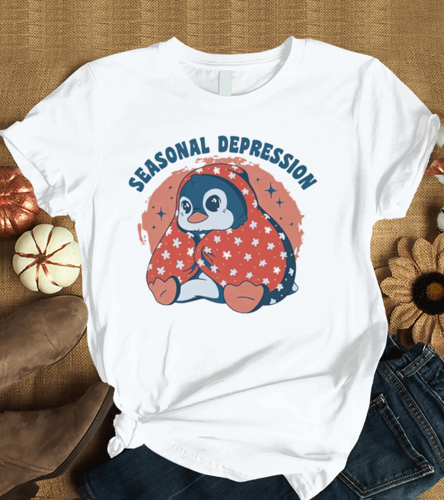 Seasonal Depression Penguin In Cozy Blanket With Stars And Flowers T-Shirt