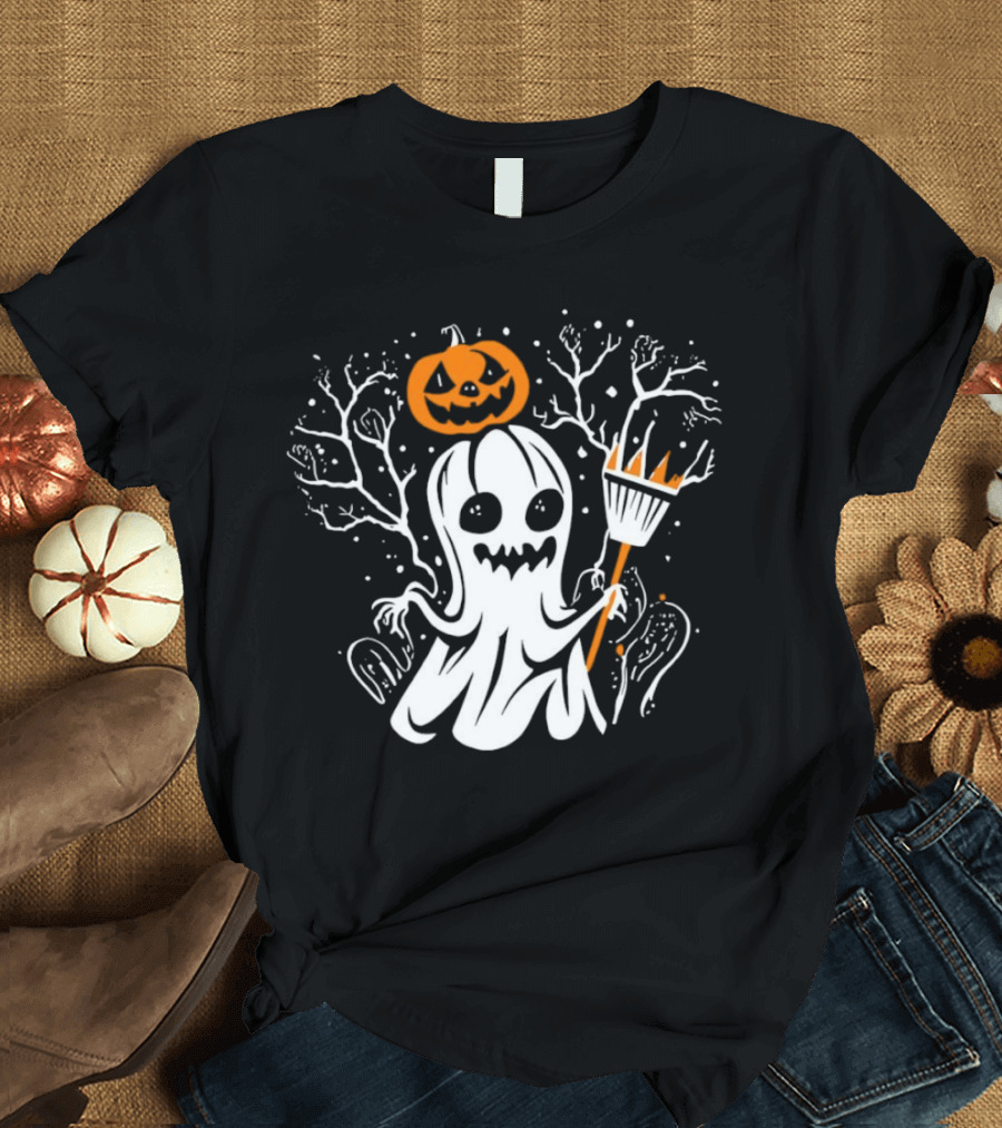 Pumpkin King Halloween Ghost With Broomstick T-Shirt