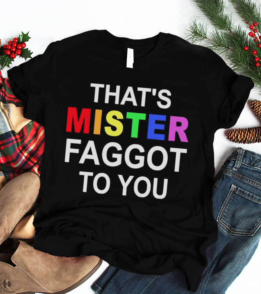 THAT'S MISTER FAGGOT TO YOU RAINBOW LETTERS Shirt made from 100% pre-shrunk ring-spun cotton, unisex regular fit based on U.S. standard sizing. The shirt is designed, cut, sewn, and printed in the United States. Available in sizes S-5XL.