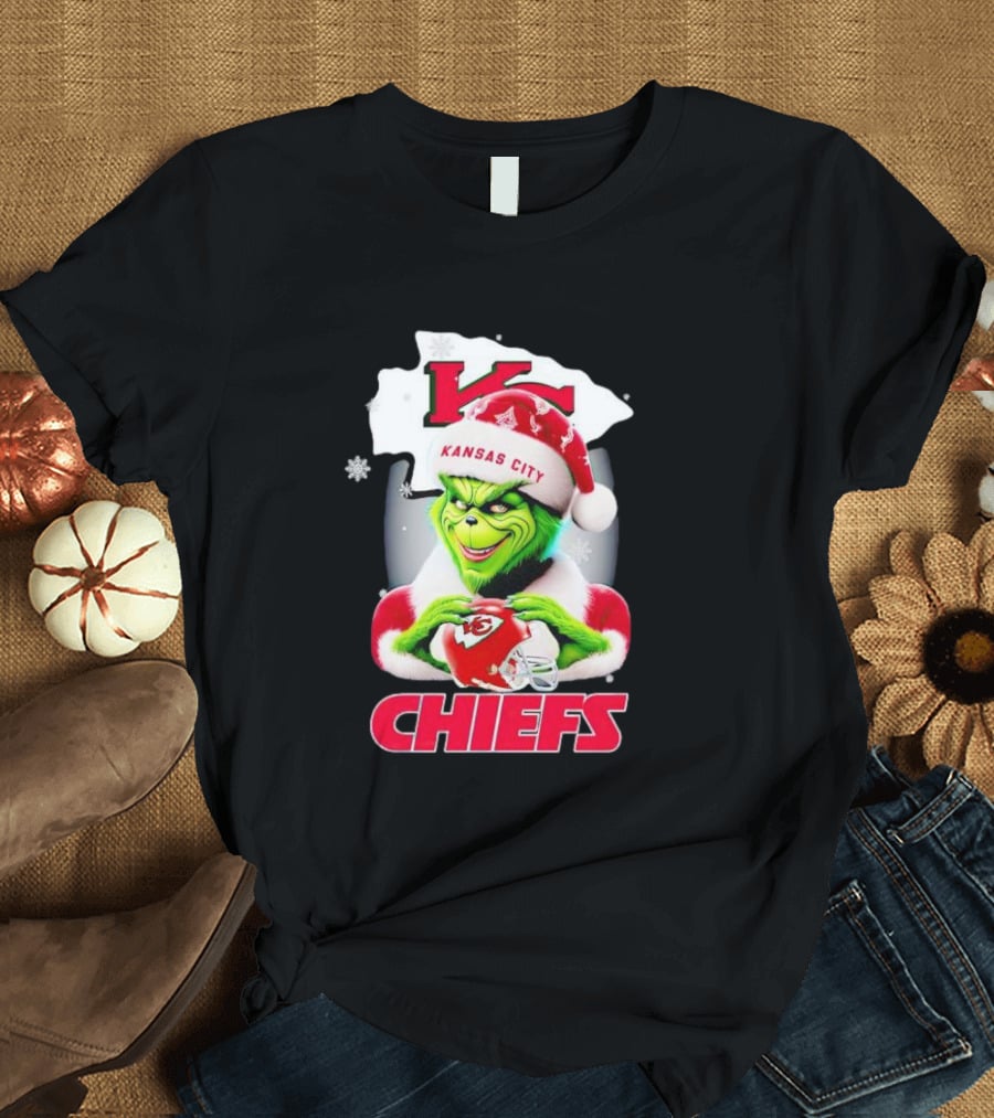 Kansas City Chiefs Christmas Grinch In Santa Hat Holding Football T-Shirt