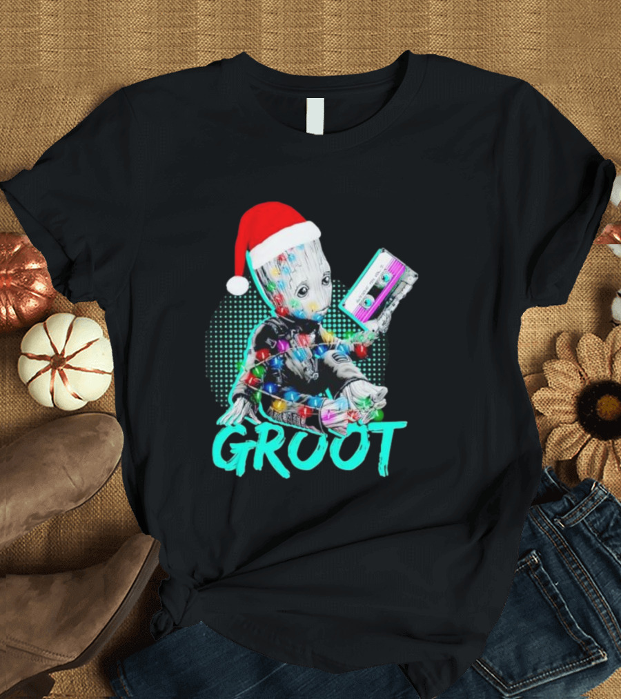 Santa Baby Groot With Cassette Tape And Holiday Lights T-Shirt