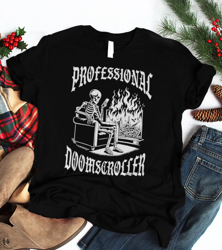 Professional Doomscroller Skeleton by Fireplace Shirt made from 100% pre-shrunk ring-spun cotton, unisex regular fit based on U.S. standard sizing. The shirt is designed, cut, sewn, and printed in the United States. Available in sizes S-5XL.