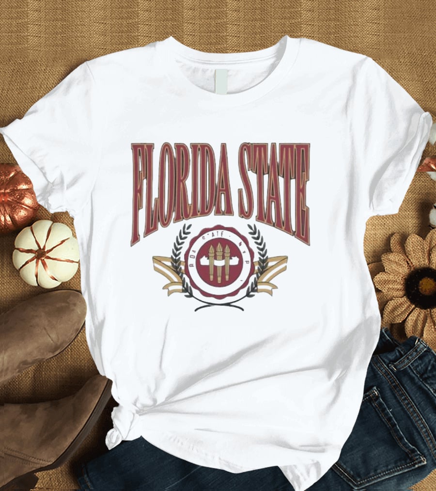 Florida State Emblem Torch Laurel Shirt made from 100% pre-shrunk ring-spun cotton, unisex regular fit based on U.S. standard sizing. The shirt is designed, cut, sewn, and printed in the United States. Available in sizes S-5XL.