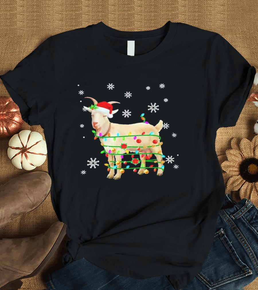 Goat Wrapped In Christmas Lights With Santa Hat And Snowflakes T-Shirt