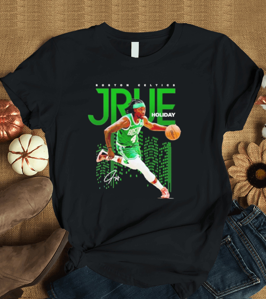 Boston Celtics Jrue Holiday Dribbling Action Shirt made from 100% pre-shrunk ring-spun cotton, unisex regular fit based on U.S. standard sizing. The shirt is designed, cut, sewn, and printed in the United States. Available in sizes S-5XL.