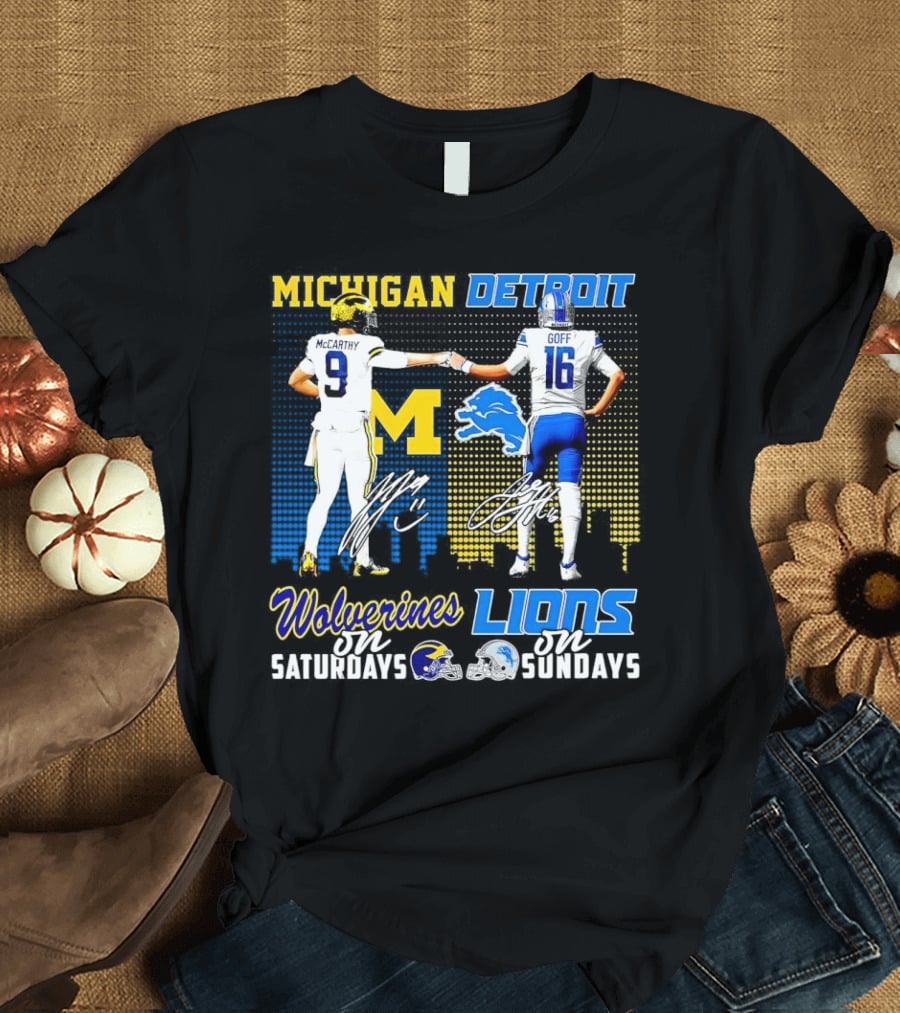 Michigan Wolverines McCarthy on Saturdays Detroit Lions Goff on Sundays Shirt made from 100% pre-shrunk ring-spun cotton, unisex regular fit based on U.S. standard sizing. The shirt is designed, cut, sewn, and printed in the United States. Available in sizes S-5XL.
