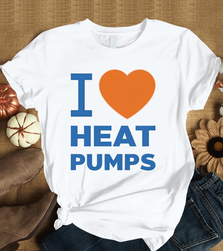 I Heart Heat Pumps Bold Blue Orange Shirt made from 100% pre-shrunk ring-spun cotton, unisex regular fit based on U.S. standard sizing. The shirt is designed, cut, sewn, and printed in the United States. Available in sizes S-5XL.