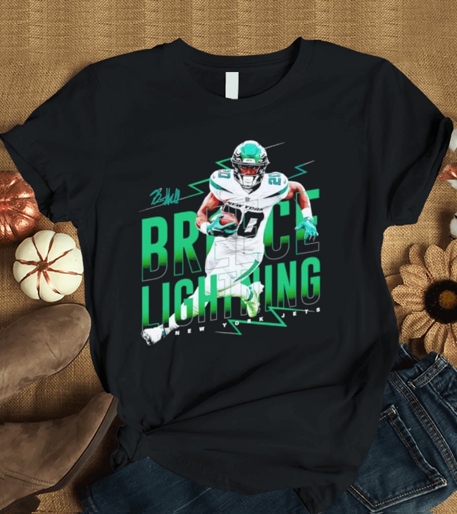 Breece Lightning New York Jets Signature Football Shirt made from 100% pre-shrunk ring-spun cotton, unisex regular fit based on U.S. standard sizing. The shirt is designed, cut, sewn, and printed in the United States. Available in sizes S-5XL.