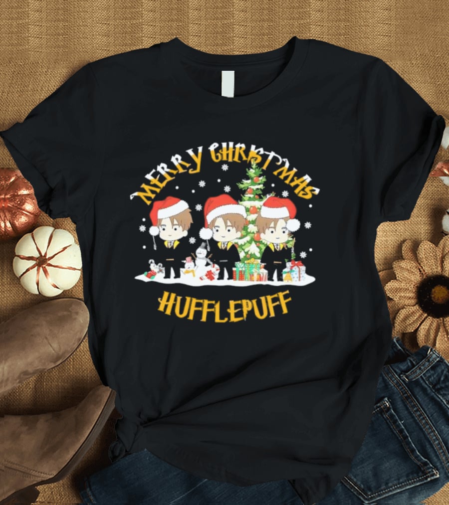 Merry Christmas Hufflepuff Characters With Santa Hats And Christmas Tree T-Shirt