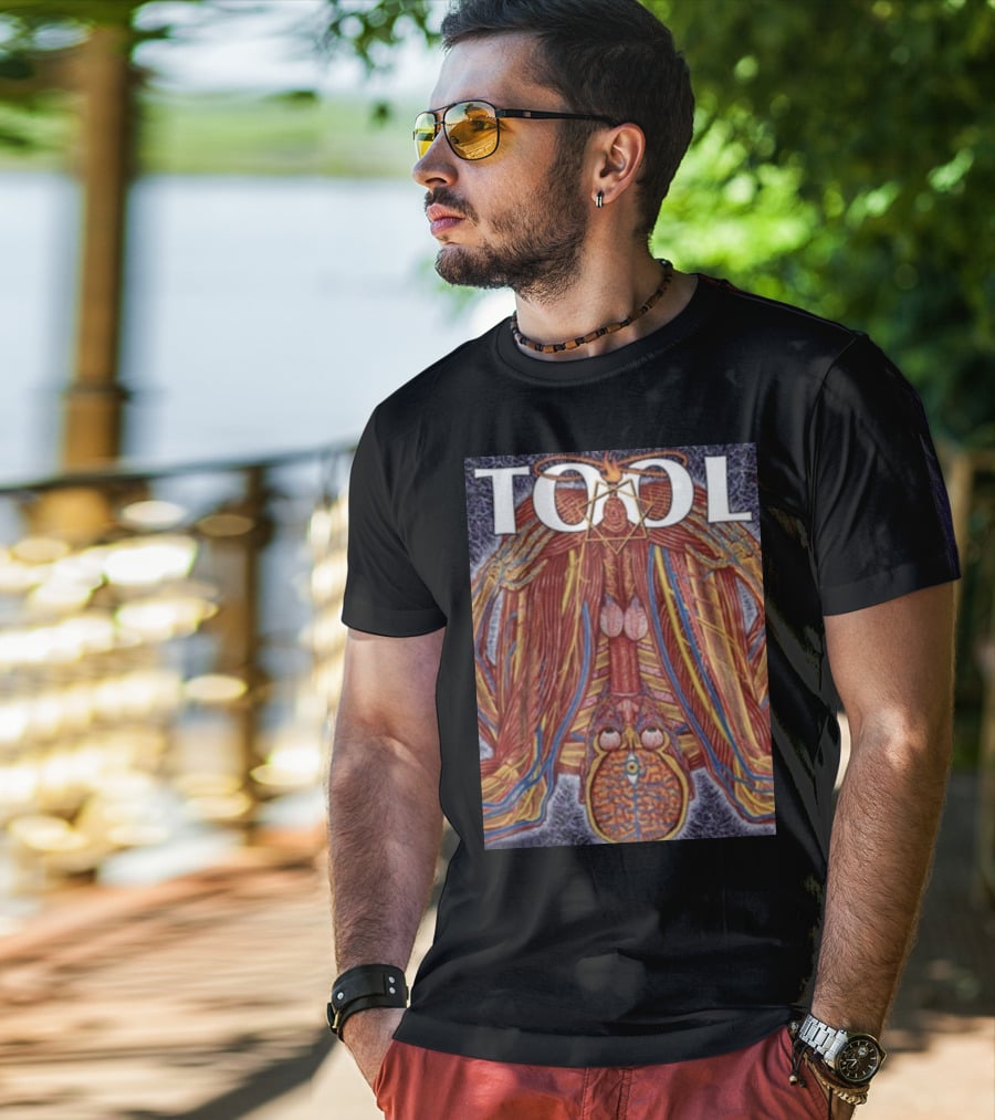 Tool Band Anatomy Shirt made from 100% pre-shrunk ring-spun cotton, unisex regular fit based on U.S. standard sizing. The shirt is designed, cut, sewn, and printed in the United States. Available in sizes S-5XL.