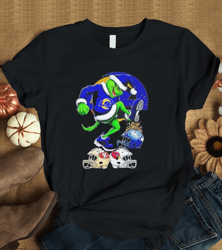 Los Angeles Rams Grinch Stomping NFL Helmets Christmas Funny Santa T-Shirt