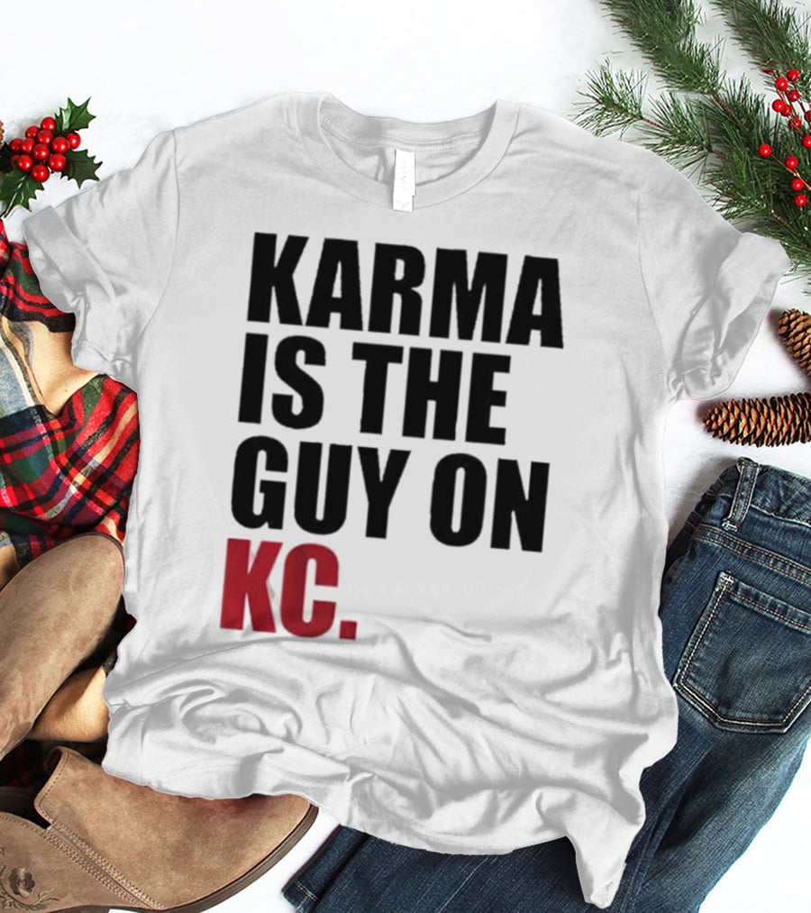Karma Is the Guy on KC Shirt made from 100% pre-shrunk ring-spun cotton, unisex regular fit based on U.S. standard sizing. The shirt is designed, cut, sewn, and printed in the United States. Available in sizes S-5XL.
