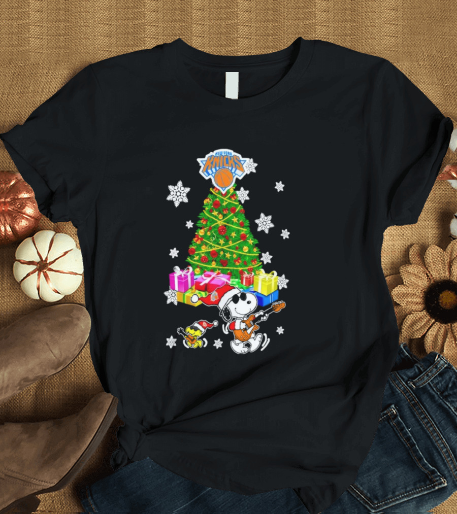New York Knicks Snoopy Woodstock Christmas Tree Gifts Snowflakes T-Shirt