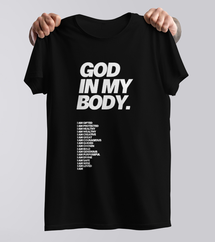 God in My Body I Am Gifted Protected Healthy Creative Great Courageous Guided Chosen Bold Generous Purposeful Divine Safe Wise Loved AJ McQueen Shirt made from 100% pre-shrunk ring-spun cotton, unisex regular fit based on U.S. standard sizing. The shirt is designed, cut, sewn, and printed in the United States. Available in sizes S-5XL.