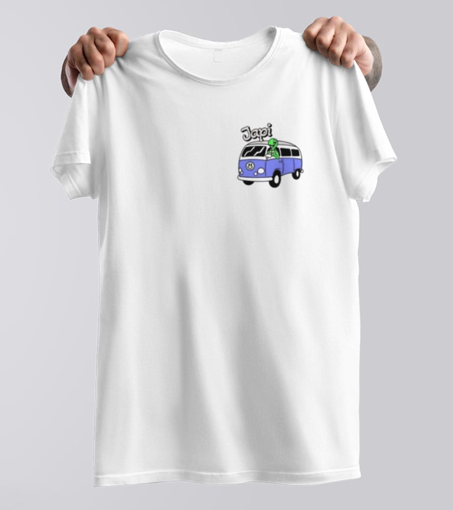 Japi Alien Character Surfer Riding Blue Peace Bus Shirt made from 100% pre-shrunk ring-spun cotton, unisex regular fit based on U.S. standard sizing. The shirt is designed, cut, sewn, and printed in the United States. Available in sizes S-5XL.