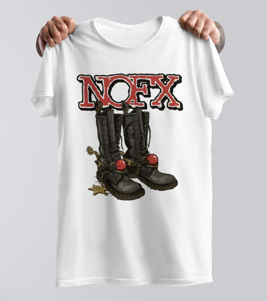 NOFX Punk Boots with Chains and Red Orbs Shirt made from 100% pre-shrunk ring-spun cotton, unisex regular fit based on U.S. standard sizing. The shirt is designed, cut, sewn, and printed in the United States. Available in sizes S-5XL.