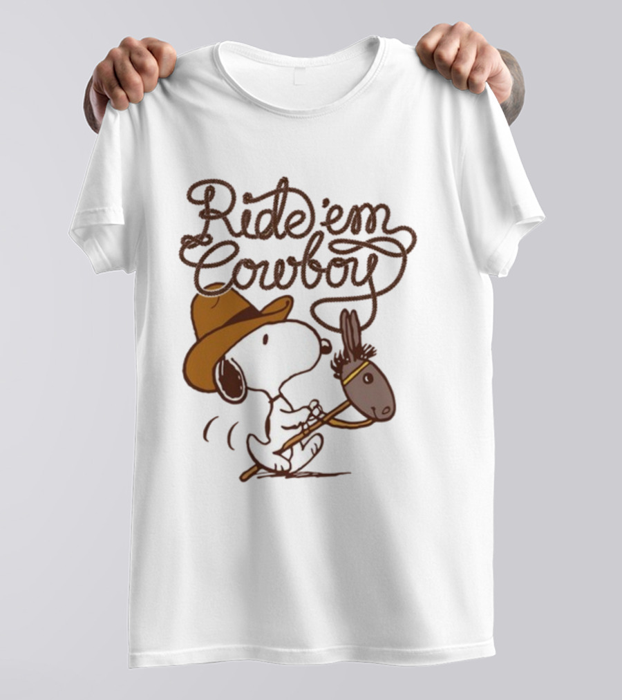 Ride Em Cowboy Snoopy Shirt made from 100% pre-shrunk ring-spun cotton, unisex regular fit based on U.S. standard sizing. The shirt is designed, cut, sewn, and printed in the United States. Available in sizes S-5XL.