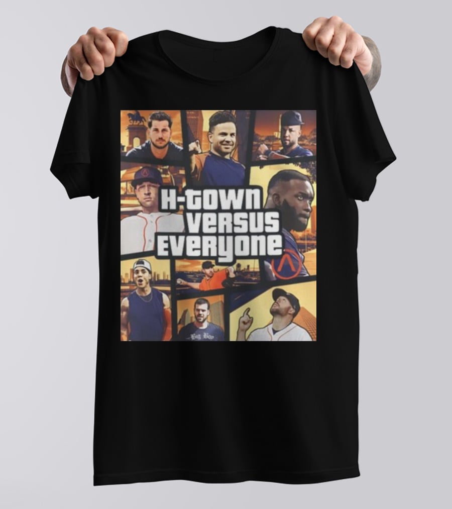H-Town Versus Everyone Houston Sports Icons Collage Shirt made from 100% pre-shrunk ring-spun cotton, unisex regular fit based on U.S. standard sizing. The shirt is designed, cut, sewn, and printed in the United States. Available in sizes S-5XL.