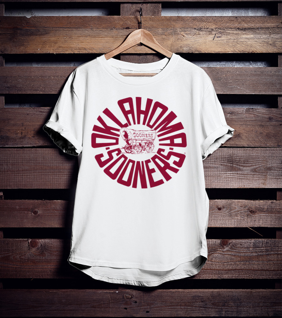 Oklahoma Sooners Covered Wagon Circle Shirt made from 100% pre-shrunk ring-spun cotton, unisex regular fit based on U.S. standard sizing. The shirt is designed, cut, sewn, and printed in the United States. Available in sizes S-5XL.